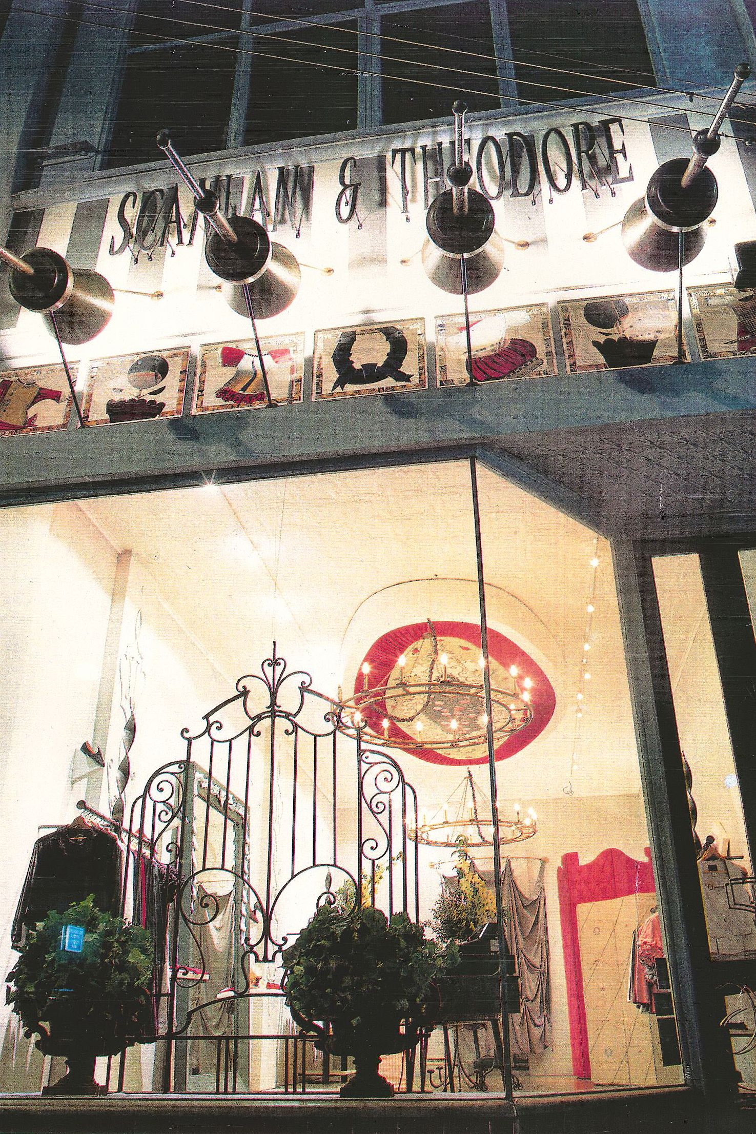 The design direction was to create an atmosphere of established sensibility. Design details included trumpet like lances protruding from the façade, ornate wrought iron throughout the boutique by metalworker Karl Millard, glass panels above the window by Gerhardt Emmerichs, a mosaic of hand painted tiles by Bern Emmerichs, metal tables by Tony Pentano and Alice in Wonderland high back chair upholstered by George Weiss.