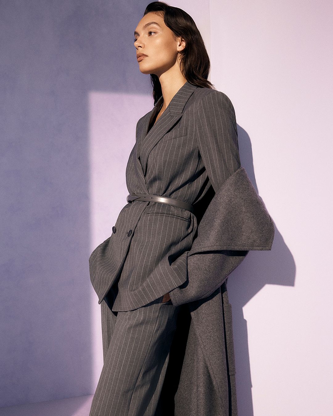 Tailored Stripe Jacket, Tailored Stripe Trouser, Drape Front Coat, Triangle Trim Belt, Pump