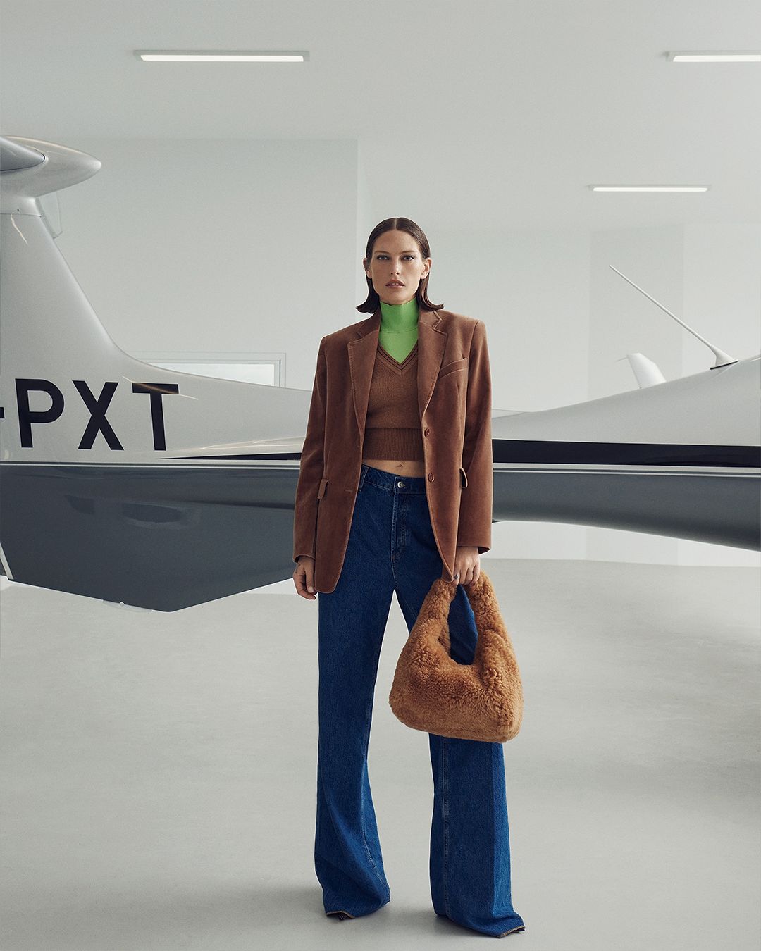 Velvet Loose Jacket, Cashmere Slim V Sweater, Micro Knit Sweater, Denim Drape Leg Jean, Shearling Gabriella, Polished Slingback 7.5